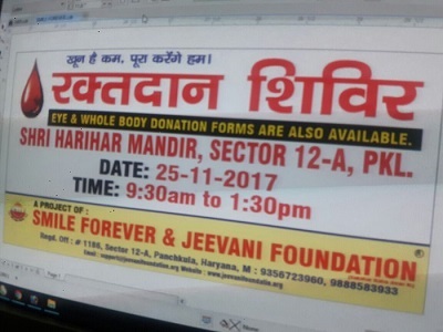Jeevani Foundation held a blood donation camp at Hari Har Mandir sector 12-a panchkula haryana for needy patients in coordination with the Smile Foundation and GMCH sector 16 chandigarh